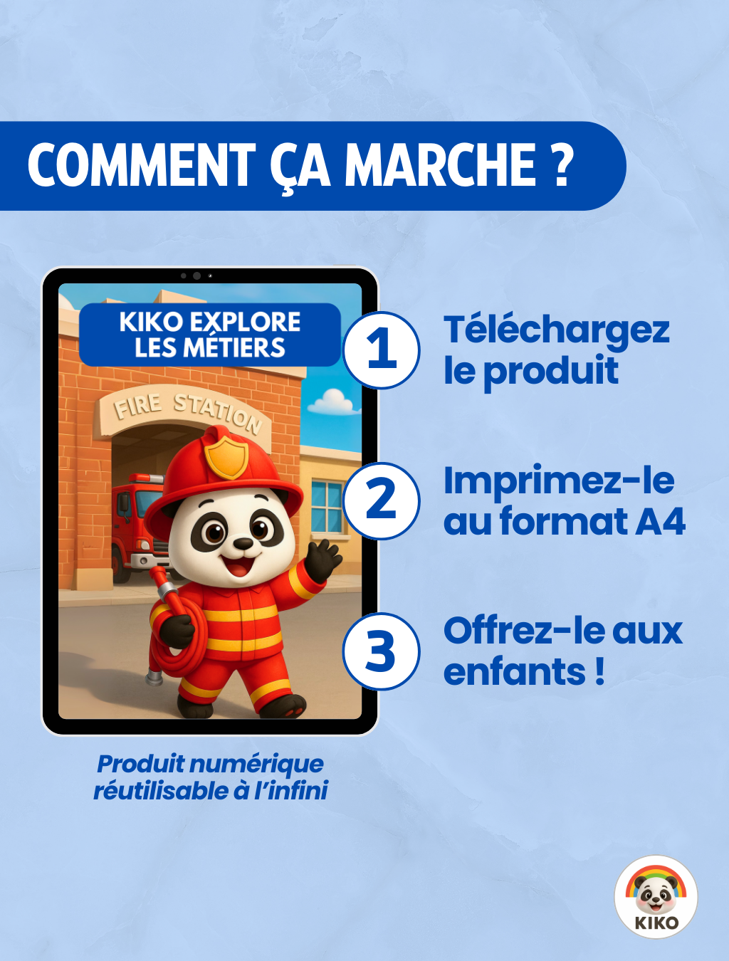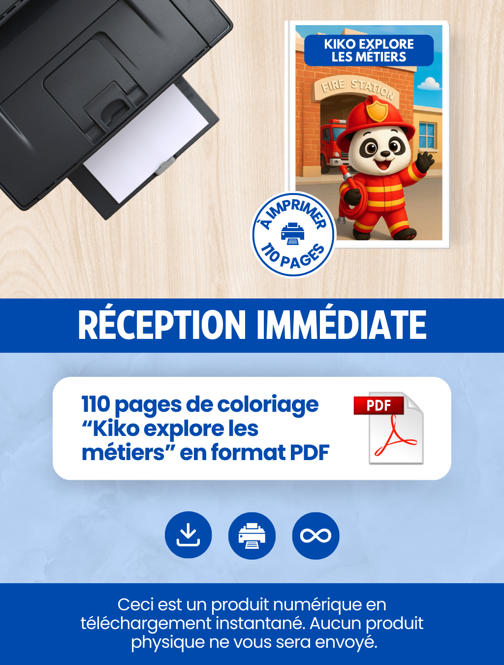 Fais découvrir à ton enfant le monde fascinant des métiers grâce à Kiko, le petit panda rigolo et aventurier ! Ce pack complet regroupe 110 coloriages uniques autour des métiers du quotidien et des rêves d’enfance : pompier, pâtissier(e), vétérinaire, astronaute, fleuriste, pilote, enseignant(e)… et bien plus encore ! 👮